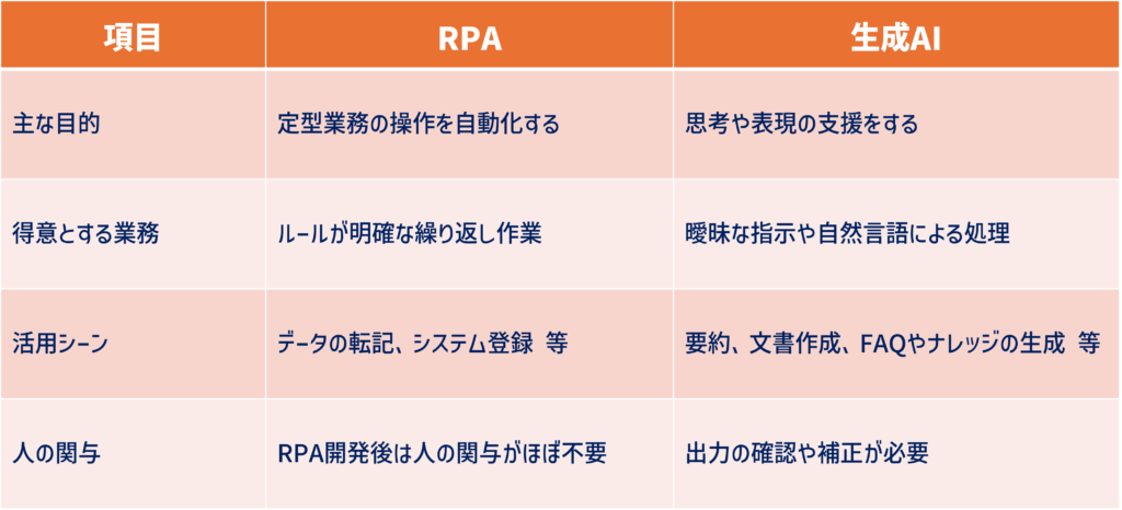 つまり、「決まった操作」ならRPA、「曖昧な判断や言語生成」なら生成AIが適しています。