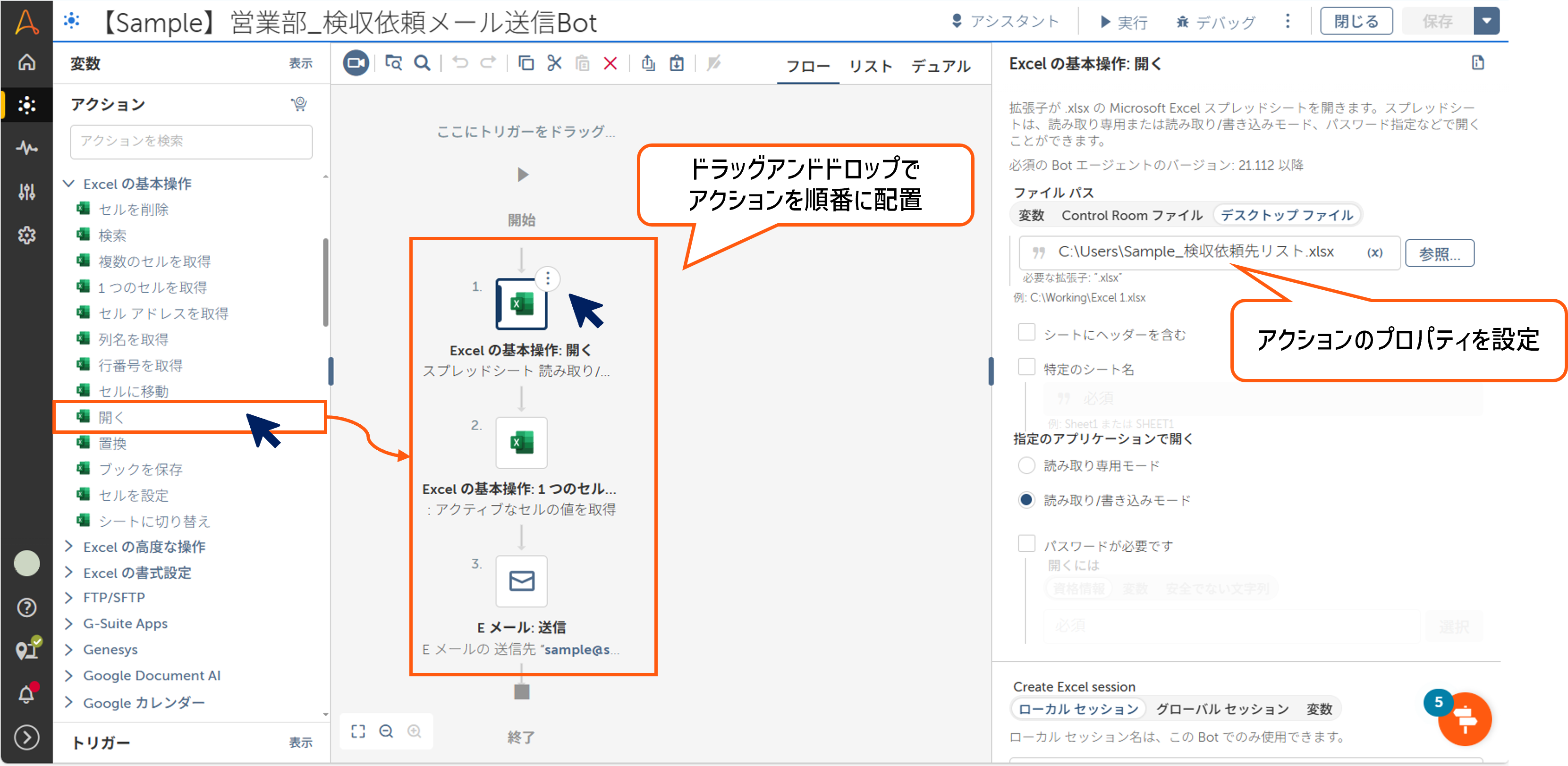 アクションパレットから、必要なアクションをワークスペースにドラッグアンドドロップして配置します。例:ファイルを開く→データを読み取る→読取結果をメールする