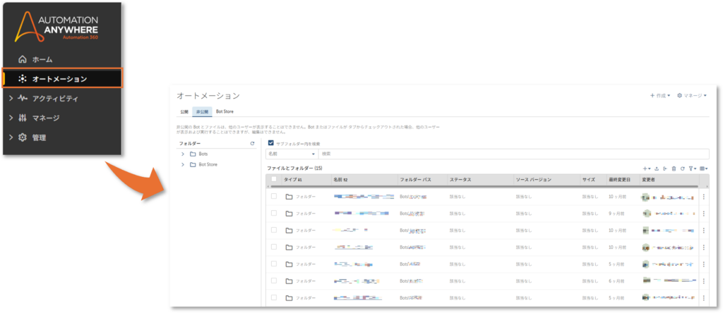 Automation 360でBot開発を始める時は、ControlRoom画面左側のナビゲーションバーから「オートメーション」タブを選択します。