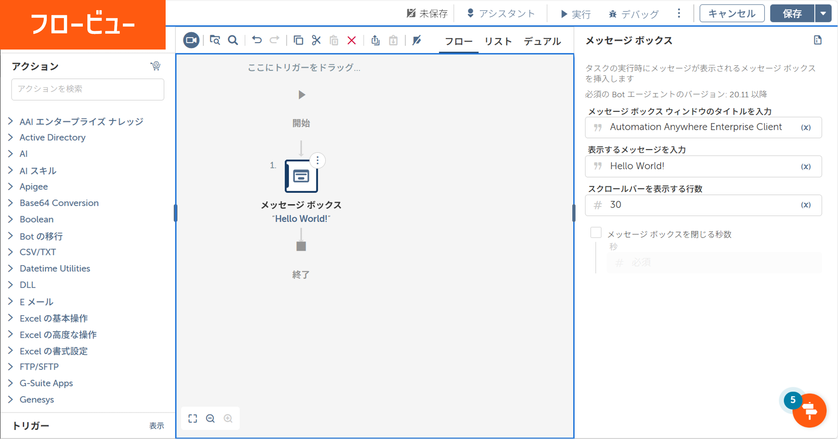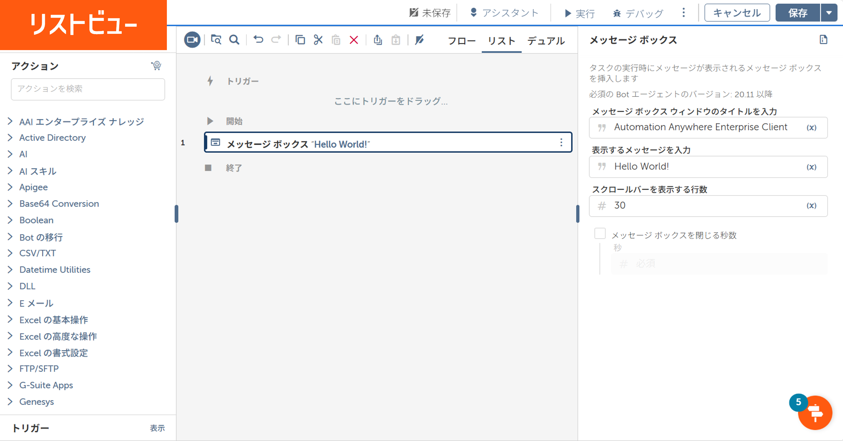 リスト:アクションのアイコンとアクションの設定内容がリスト形式でコンパクトに表示されるビュー。処理が多い場合は、こちらのビューが見やすくおすすめです。