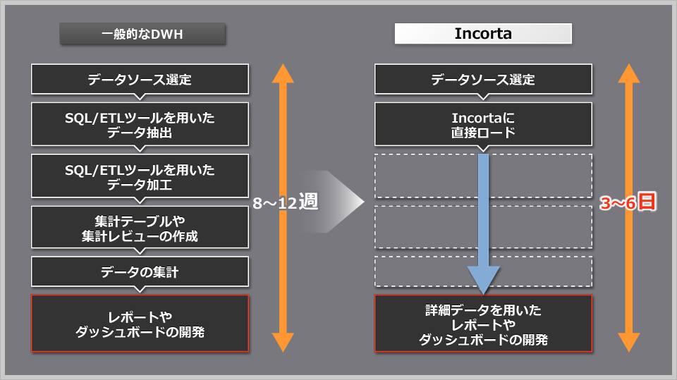 - Incortaはデータソースのメタデータを取り込み、論理的にスキーマ定義を実施し、定義したスキーマへデータを直接ロードするという手法であり、実際のデータを見ながら構築を進めることができるので手戻りが少なく、データの可視化(帳票化)が3~6日で可能(一般的なDWHではデータソースを選定し、データの加工、集計などを行うため、データ可視化まで時間を要する傾向にある)