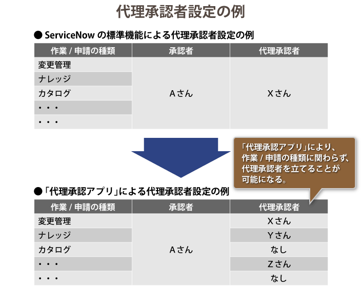 ServiceNowの標準機能で、承認行為に代理承認者を立てることが可能です。本アプリはその機能を補完し、カタログなどの申請の種類に応じて別の代理承認者を立てることが可能となります。 また、変更管理やナレッジといった作業の内容に応じて別の代理承認者を立てることも可能となります。
