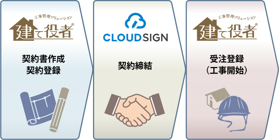今回提供を開始する『クラウドサイン連携オプション』を利用することにより、建て役者ユーザーは『建て役者』を通じて、クラウド上で契約作業を完結することが可能となります。