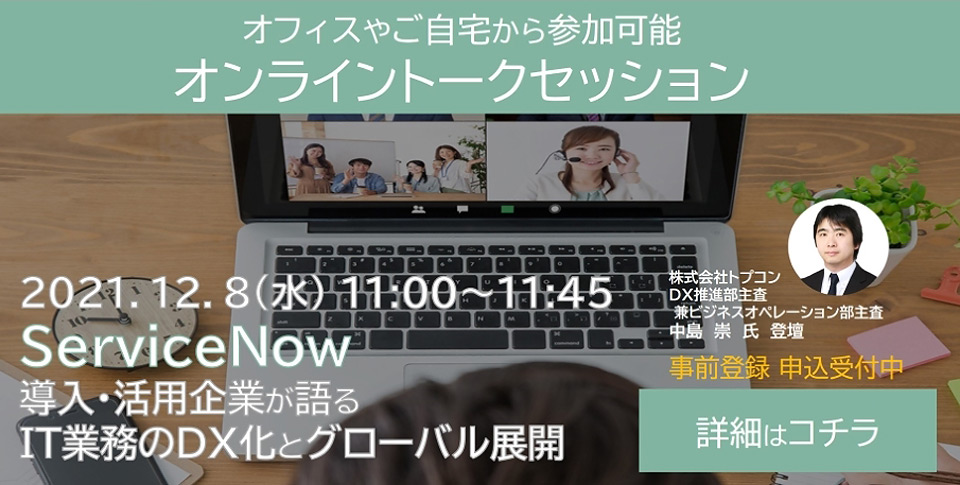 弊社はこのたび、2021年12月8日(水)に「ServiceNow導入・活用企業が語るIT業務のDX化とグローバル展開」と題し、株式会社トプコン(以下、トプコン)の中島様をお招きしたトークセッションを開催いたします。