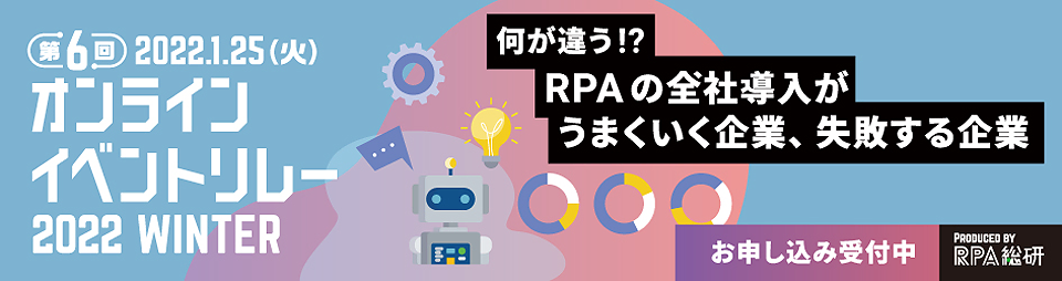 弊社はこのたび、RPA総研が主催する『オンラインイベントリレー 2022 WINTER』にて、ウェビナーを実施することとなりましたのでお知らせいたします。