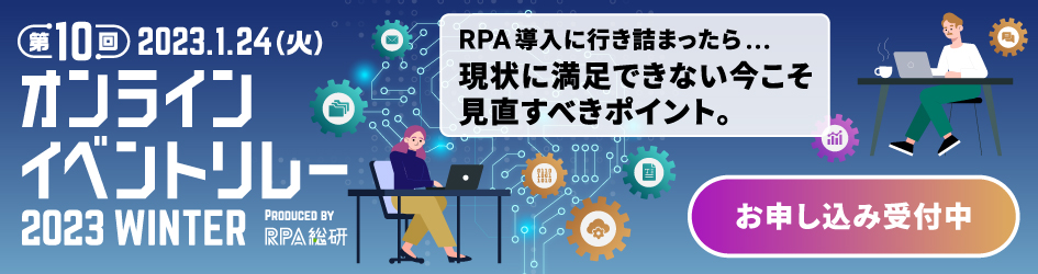 弊社はこのたび、RPA総研が主催する『オンラインイベントリレー 2023 WINTER』にて、ウェビナーを実施することとなりましたのでお知らせいたします。