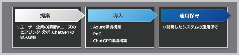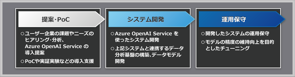ChatGPTをはじめ、GPT-3/3.5/4やCodexといった「Azure OpenAI Service」の導入支援サービスです。ユーザー企業の課題やニーズのヒアリング・分析、PoC、Azure OpenAI Service を用いたシステム開発、運用保守やチューニングまで、一貫してサポートします。 - 【本サービスのプロセス例】
