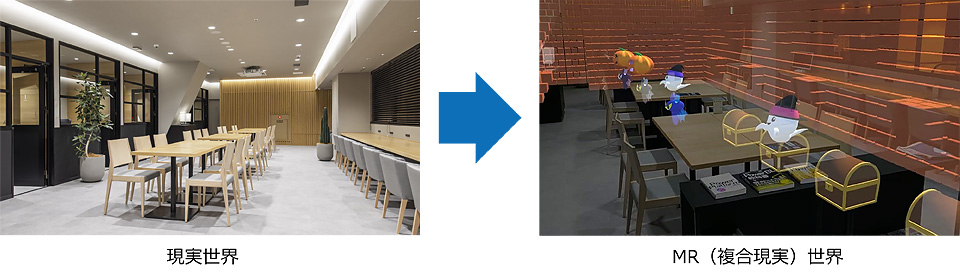 ①MRゴーグルを装着すると、会場がハロウィン仕様のMRの世界に早変わりします。