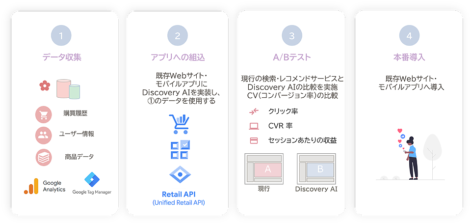 ECサイトなどを展開する小売業向けに、Google Cloudが提供する最先端のAIテクノロジー「Discovery AI」を導入し、ECサイトにおけるパフォーマンス向上を実現するサービスを提供します。Discovery AIは、自社ECなどのデジタル資産に対して、Google品質の検索、ブラウジング、レコメンデーションの機能などを提供し、ユーザーに合わせたショッピング体験を提供するとともに、ECサイトでのコンバージョンを増やし、検索の中断を削減することができます。現行データに合わせたアーキテクチャ設定や、現行の検索・レコメンドサービスとDiscovery AIとの比較検証を行い、効果測定の結果からビジネス拡大をサポートします。