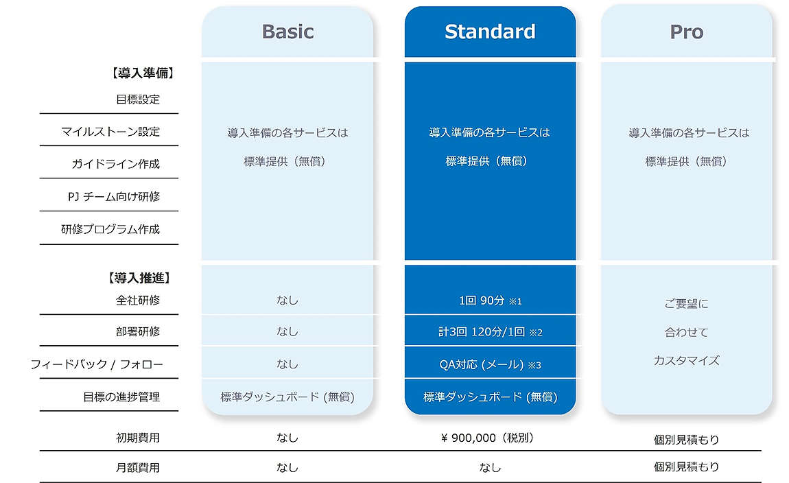 Proプランは、Basicプランの支援内容はそのままに、Standardプランでご提供していた内容を企業ごとにアレンジする、完全カスタマイズのプランです。研修やワークショップの開催回数、実施内容など、ユーザーが求めるコンテンツのご提案が可能です。