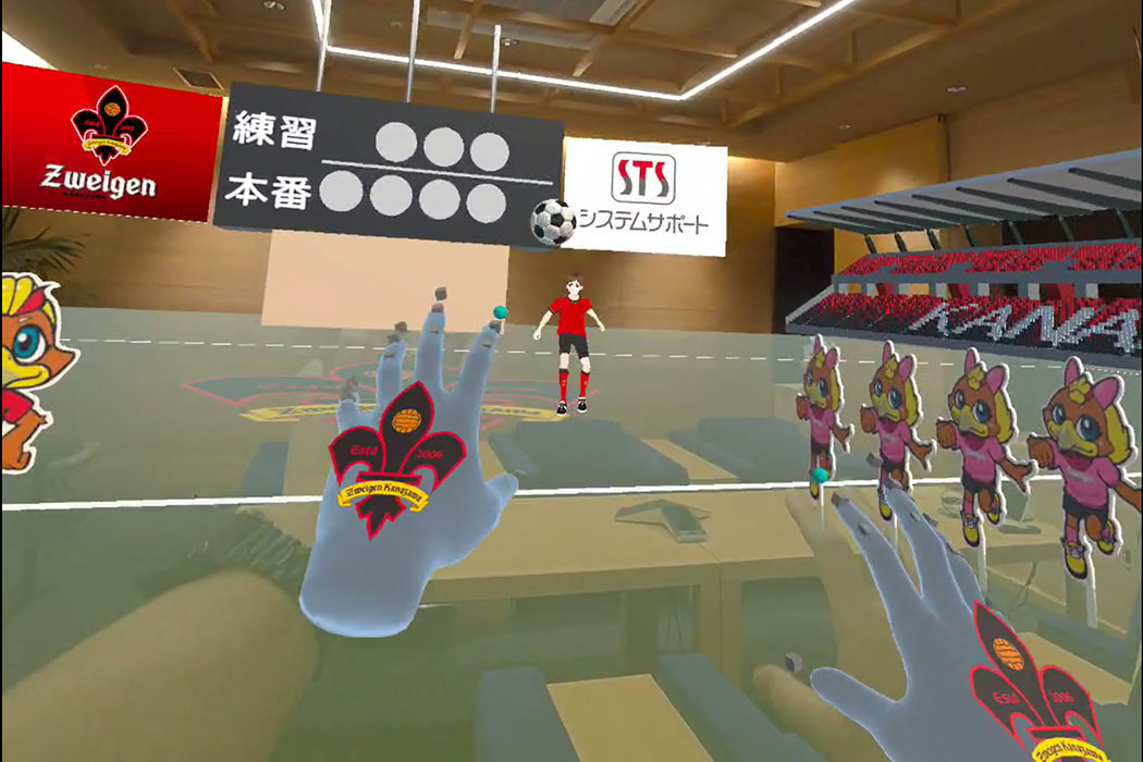 ツエーゲン金沢の応援歌を聴きながら、新スタジアム(金沢ゴーゴーカレースタジアム)さながらの仮想空間でツエーゲン選手からのシュートを受け止めるPK体験ができます。