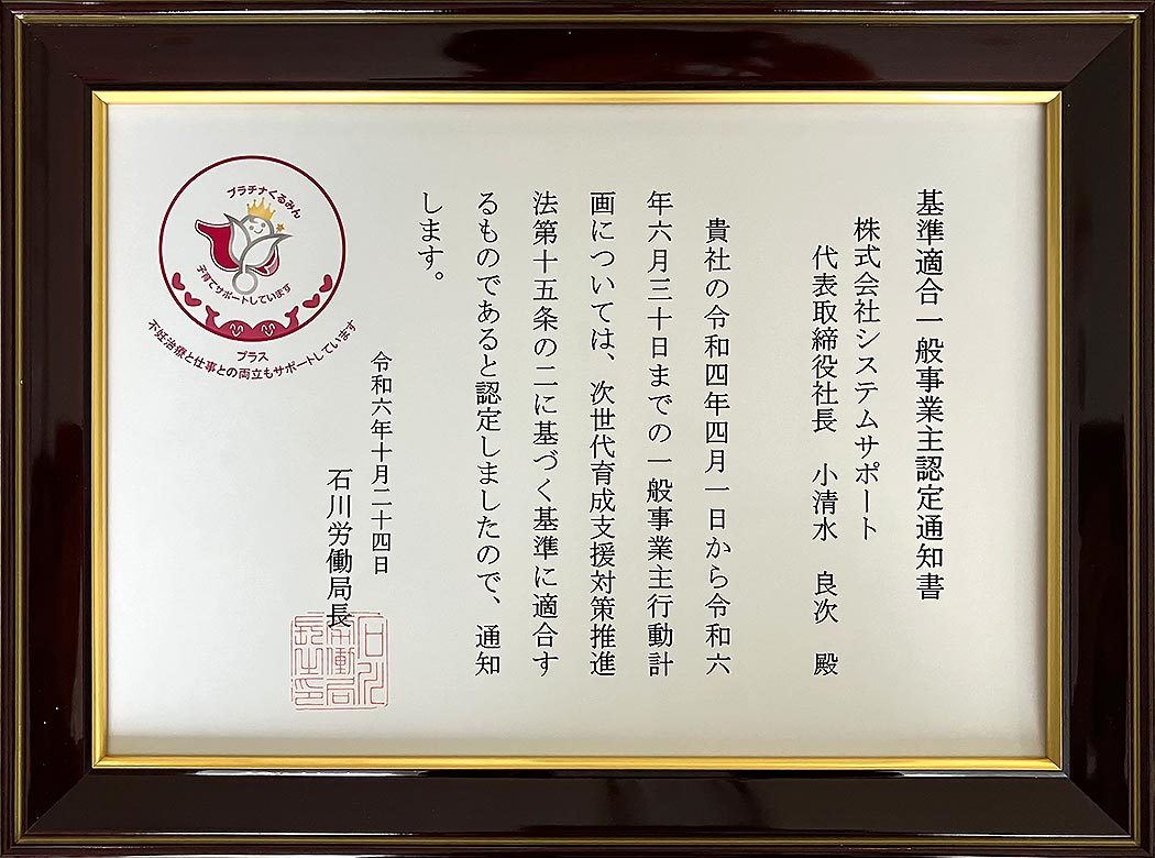 弊社はこのたび、厚生労働省 石川県労働局より、子育てサポート企業としての取り組みの実施状況が特に優良である「プラチナくるみん認定企業」として認定されました。併せて不妊治療と仕事を両立しやすい職場環境整備に取り組む企業として「プラス」認定を取得しました。プラチナくるみんプラスの認定取得は、石川県内で2社目です。