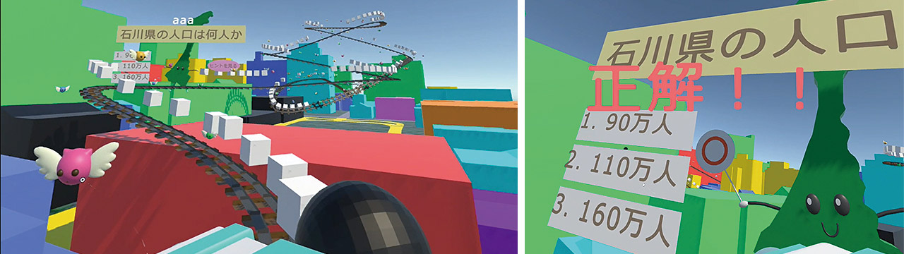 石川県の魅力について、ゲームを通じて学習できるVRアプリです。国土交通省が主導する3D都市モデルのオープンデータを活用し、金沢市の街並みをVR空間内に再現。プレイヤーは、ジェットコースターに乗って金沢市の街並みをクイズに答えながら進み、楽しみながら金沢の魅力を学ぶことが可能です。アプリの体験から石川県に興味を持っていただくことで、将来的な観光促進につなげたいという想いを込めて作成されました。