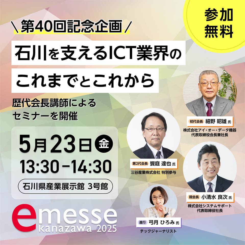 | セミナー登壇情報 | 2025年5月23日(金)13:30~14:30 《第40回記念企画》 石川を支えるICT業界のこれまでとこれから 【講師】 初代会長 細野 昭雄様(株式会社アイ・オー・データ機器 代表取締役会長兼社長) 第2代会長 饗庭 達也様(三谷産業株式会社 特別参与) 現会長 小清水 良次(株式会社システムサポート 代表取締役社長) 【進行】 テックジャーナリスト 弓月 ひろみ 様 【概要】 歴代会長2名をお迎えして現会長と共に、業界の発展の軌跡や課題、未来への展望について語っていただきます。 技術革新や地域社会への貢献、次世代に繋げていくことなど、多角的な視点から議論を展開し、ICT業界の歩みを振り返りながら、さまざまな産業の成長の可能性を探るトークにご期待ください。 ![]() |