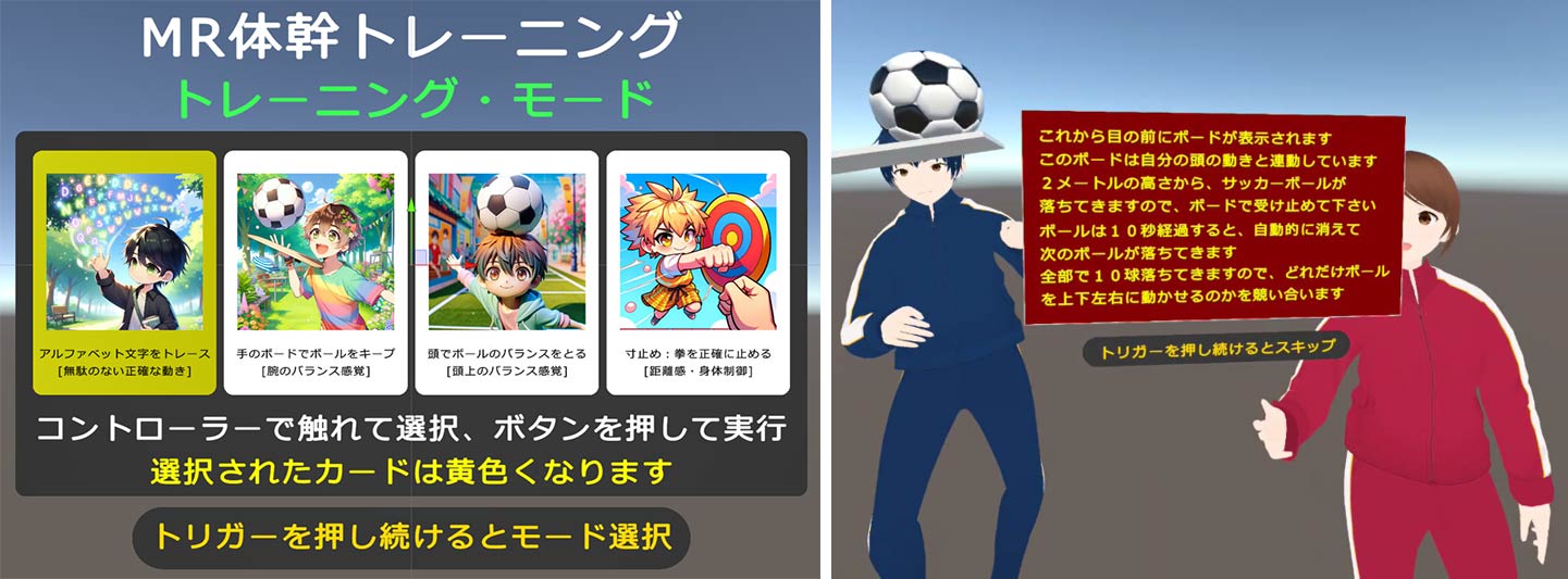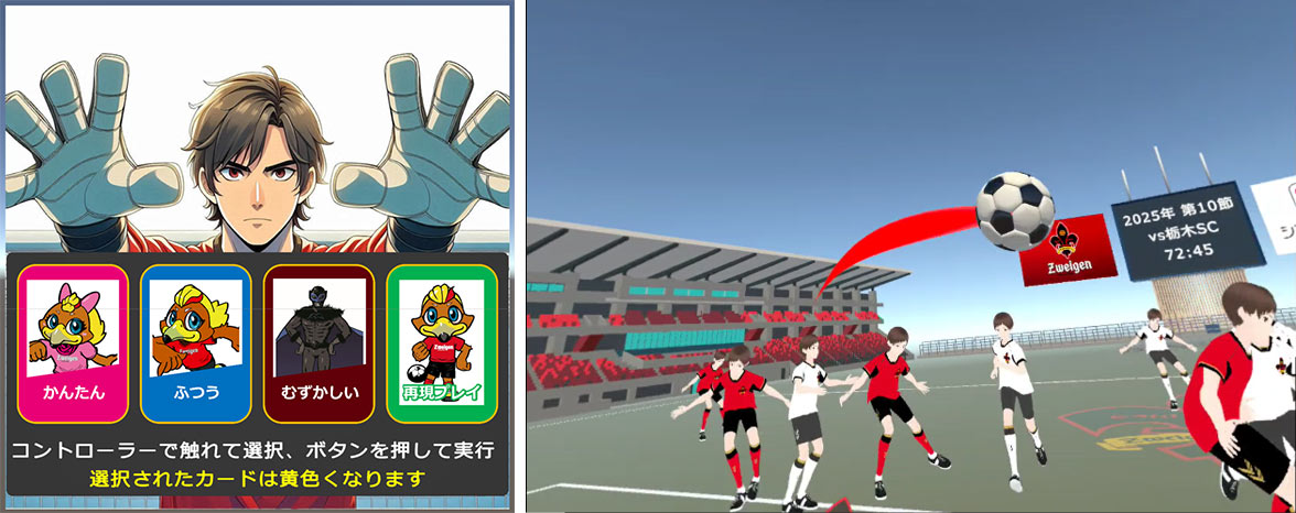 | 体験コーナー出展内容 | 2025年5月24(土)10:30~15:00 【体験コーナーA】 【ツエーゲン金沢コラボレーション】MR(Mixed Reality:複合現実)アプリ体験 今回の展示会では、以下の2つのMRアプリを体験できます。 ① デジタル・ツエーゲン金沢と仮想空間でPK対決! ツエーゲン選手の素晴らしいシュートをMRで再現!あなたの手で止めてみよう! ![]() バランス感覚と体幹をMRでトレーニングしてみよう! ![]() |