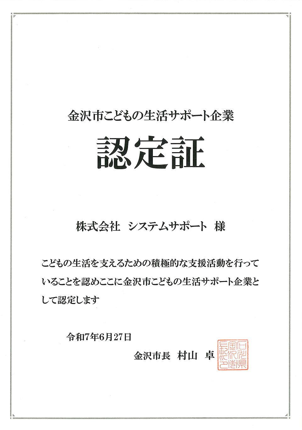 6月27日に行われた「金沢市こどもの生活サポート企業認定交付式」にて、金沢市長 村山 卓様より金沢市こどもの生活サポート企業認定証を交付いただきました。