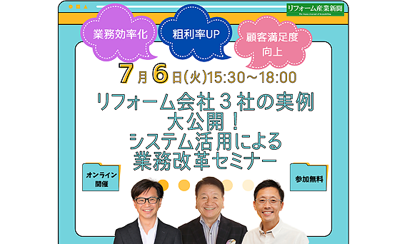 2021.6.22 お知らせ リフォーム産業新聞社主催「リフォーム会社3社の実例大公開!システム活用による業務改革セミナー」へ登壇のお知らせ