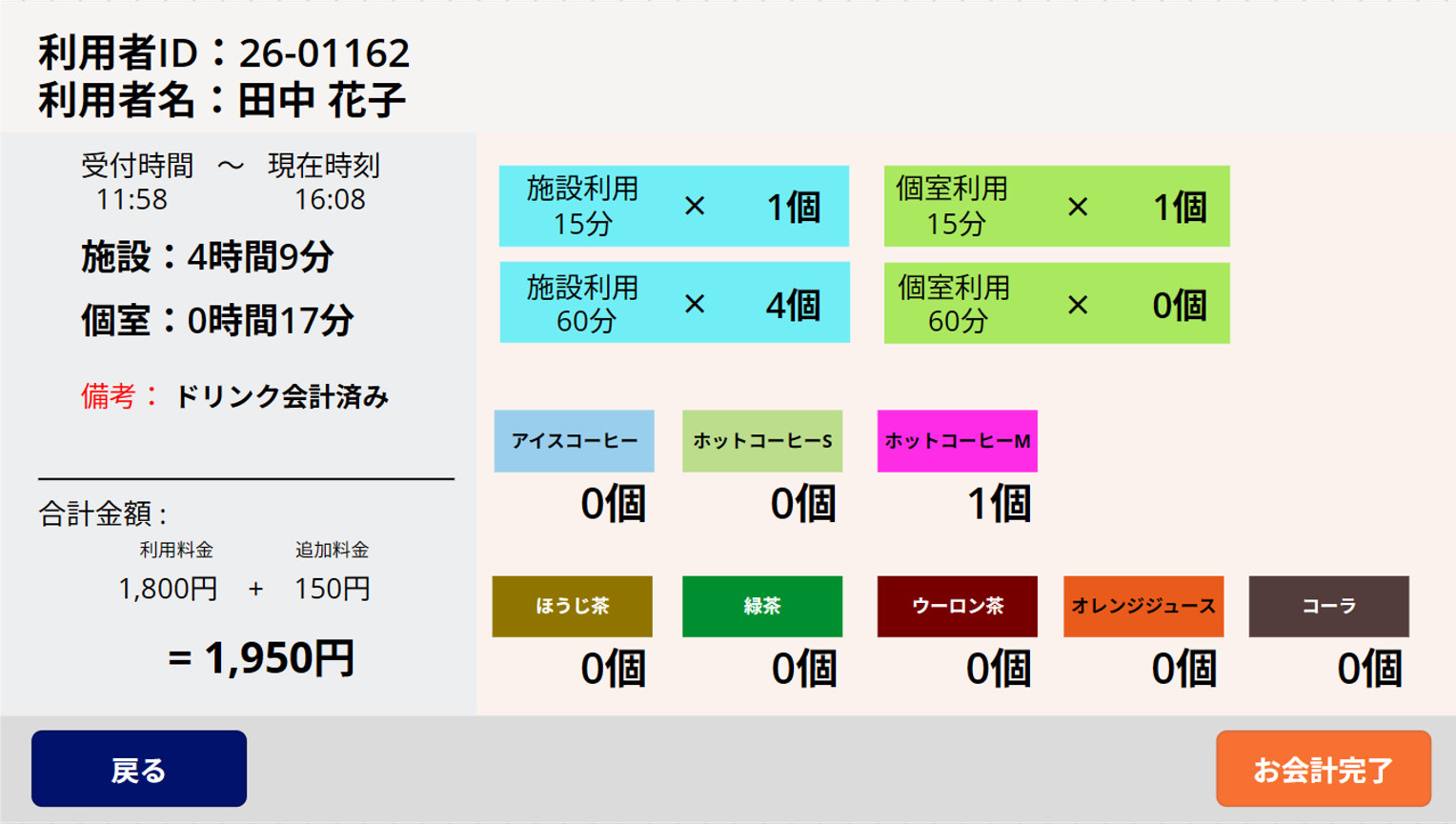 - 会計時、利用時間と注文したドリンクをもとに料金を自動算出し、会計を完了します。(利用データは蓄積され、分析に活用することで、今後の運営改善につなげることができます。)
