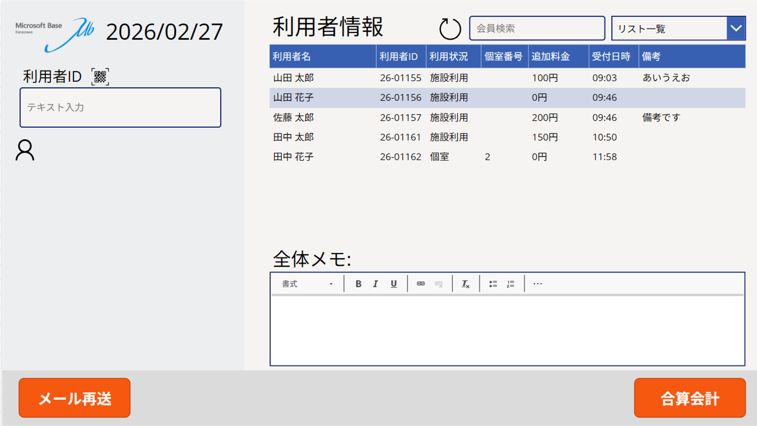 最も身近な地域課題の一つとして、Microsoft Base Kanazawaにおけるコワーキングスペースの受付業務に着目し、その課題解決を目的として開発したアプリケーションです。会員登録後に送付される二次元コードを活用して利用者情報を管理し、施設利用・個室利用の時間や追加ドリンクの情報をもとに、料金を自動で算出します。さらに、複数人の合算会計や会員登録メールの再送、利用データの蓄積・可視化にも対応しており、受付対応の正確性向上と業務負担の軽減を実現します。