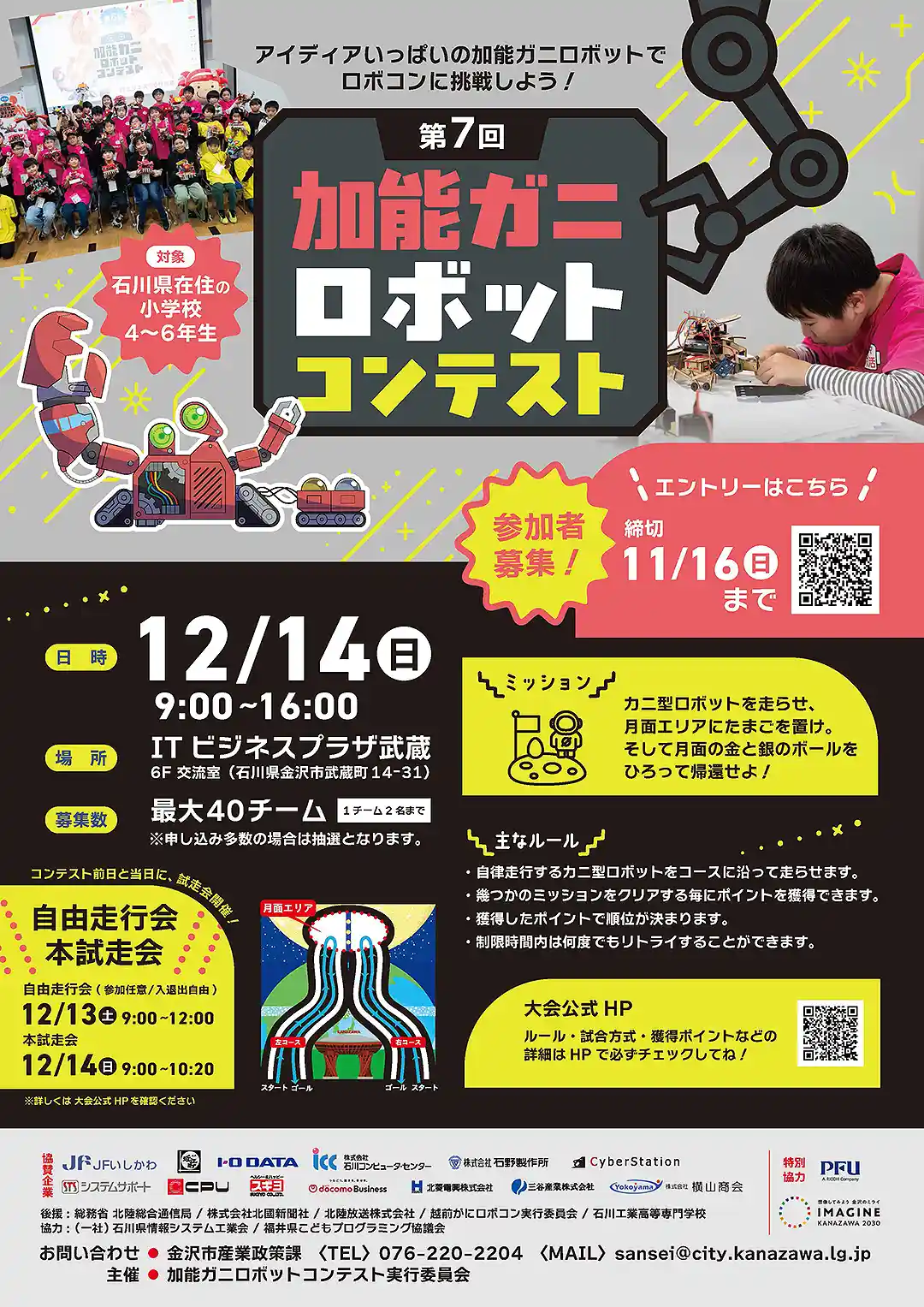 加能ガニロボットコンテストは、北陸の冬の味覚である石川県産のズワイガニ「加能ガニ」をモチーフに、小学生が自作のロボットを使ってプログラミング技術の腕前を競うコンテストです。