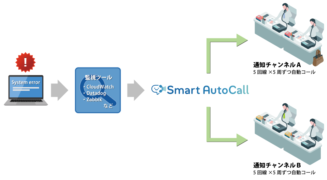 Smart AutoCall は、システム単位で通知先を設定でき、1システムに対して最大2つの通知チャネルを設定可能です。また、1つの通知チャネルに対しては最大5件ずつ電話番号が登録可能です。Smart AutoCall は、監視ツールから通知を受けると、各チャネル5周ずつ、最大50回自動コールし、通話状態が確認できた時点でコールを停止します。システムが自動コールする仕組みのため、有人対応の24時間365日監視サービスよりも費用を抑えることが可能です。