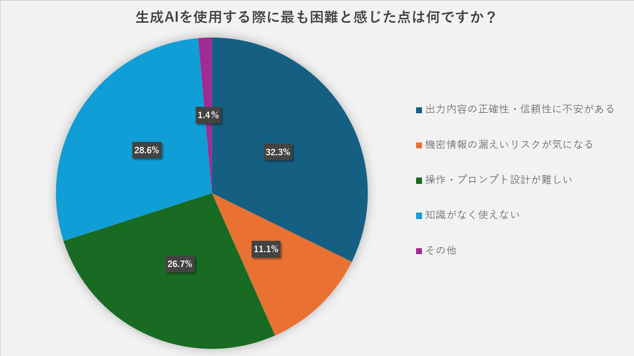 中でも「社内文書を読ませても要点がつかめない」という声が多く、39.6%が「出力内容の正確性や信頼性に不安がある」、32.3%が「文脈や意図を正しく理解していない」と感じており、精度面への課題が目立ちました。