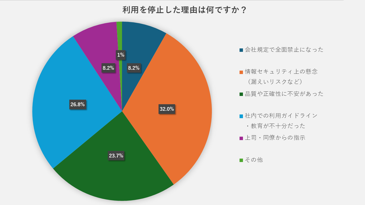 次いで、「社内の利用ガイドライン・教育が不十分だった」(26.8%)、「品質や正確性への不安」(23.7%)が続きます。