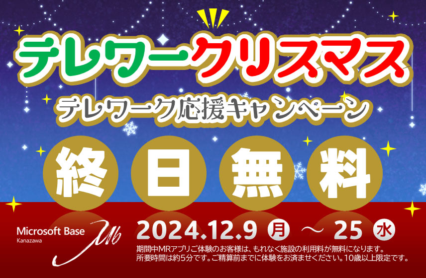 弊社の運営する Microsoft Base Kanazawa では、テレワーク等で気軽に利用できる『テレワークリスマス ~テレワーク応援キャンペーン~』を12月25日(水)まで開催しています。