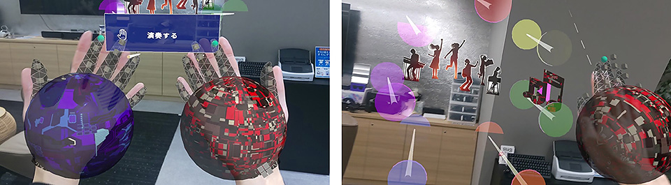 ③ 「赤い音符」を右手の「赤い球体」で、「青い音符」を「左手の青い球体」でタッチすると音楽が演奏できる仕組み。正しくタッチしてハイスコアを目指します。