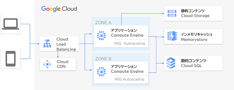 ユーザーの需要に合わせ、VMインスタンス(仮想的なコンピューター)を自動で増減させることが可能なソリューション。負荷に応じてサーバーが自動スケールされるため、アクセスがピークとなる時間帯・時期に合わせて高スペックなサーバーを予め準備する必要がなくなります。また、アクセスの少ない場合も利用量に応じて調整されるため、コスト削減につながります。アクセス量が正確に予測できない場合、自動スケール時の最大スケール数を多めに設定していくことで、アクセス数が急増した場合でも、サイトダウンすることなく安定的な利用を実現。特定サーバーへの負荷を下げ、運用の簡易化・最適化を実現します。