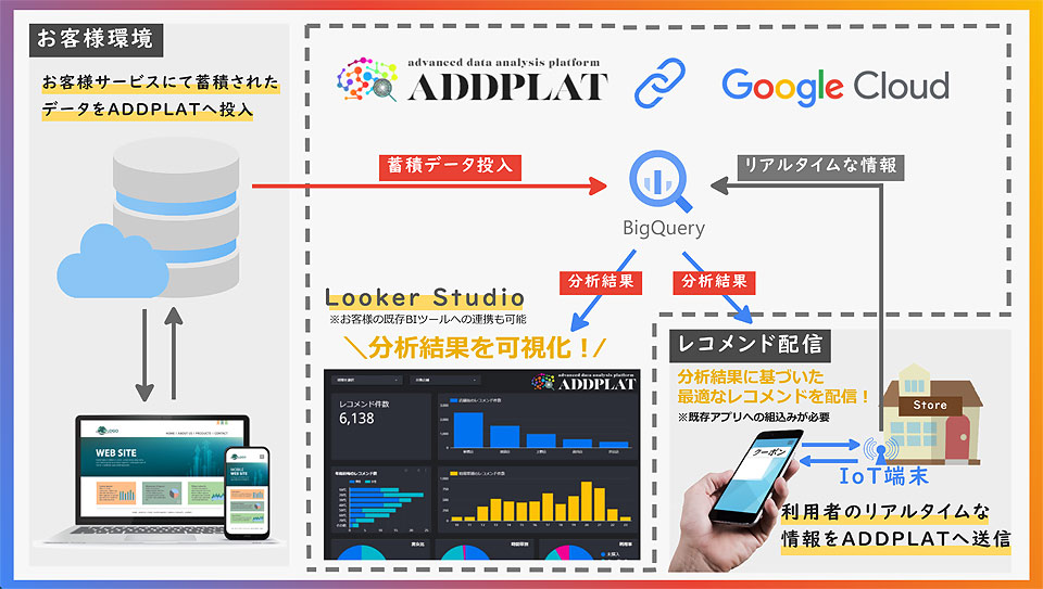 すでにオンプレミス環境や別サービスでデータ蓄積されている場合であっても、『ADDPLAT』を利用してBigQueryへデータ連携することが容易です。また、完全にデータを移管する、既存のシステムを残しつつデータを随時連携するなどのカスタマイズが可能です。機械学習によって得られた分析結果はデータポータル(BIツール)にて様々な形で表現することだけでなく、既にお使いのBIツールと連携してご利用いただくことも可能です。既存のサービス(スマホアプリなど)と連動し、コンシューマ向けにレコメンドを配信するなどのカスタマイズもあり、ユーザーの状況に応じて最適な環境をご用意いたします。