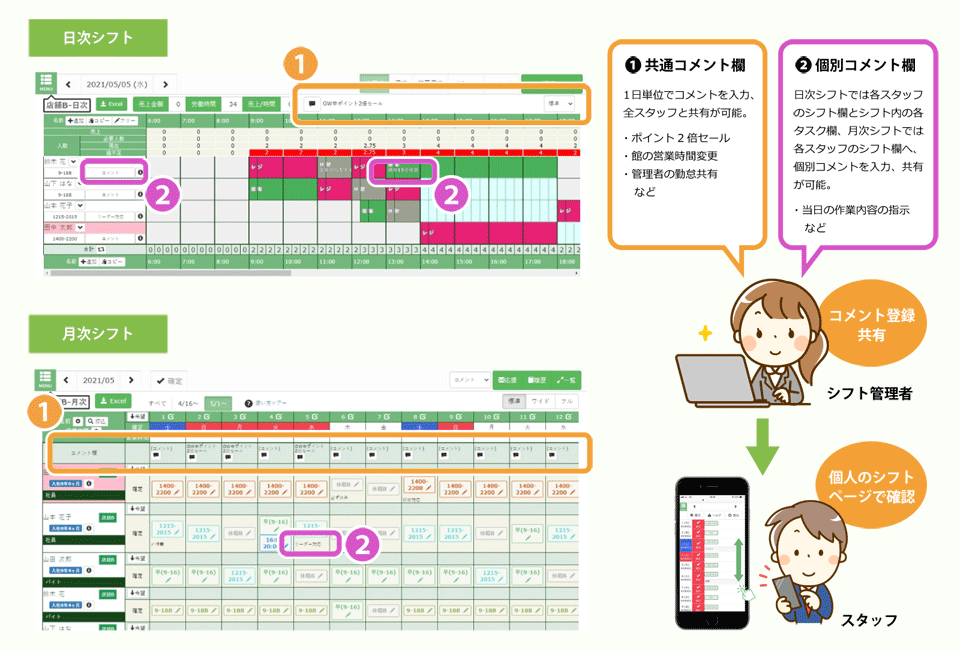 1.日次シフト・月次シフトのコメント入力