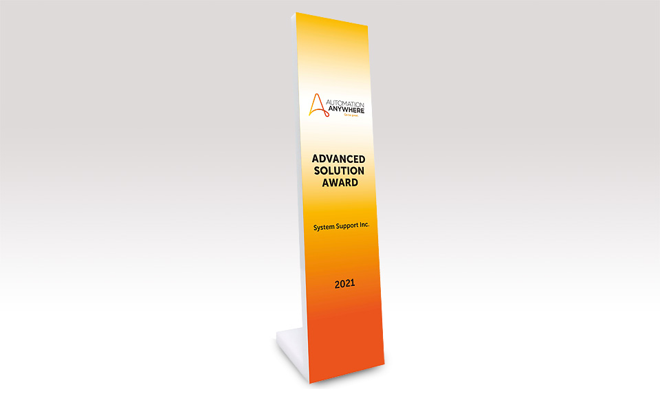 株式会社システムサポート(本社:石川県金沢市、代表取締役社長:小清水 良次、以下STS)は、RPA(ロボティック・プロセス・オートメーション)ソフトウェアプロバイダのオートメーション・エニウェア・ジャパン株式会社(本社:東京都千代田区、アジア太平洋・日本地区担当エグゼクティブ バイス プレジデント:エイドリアン ジョーンズ、以下「オートメーション・エニウェア」)の「Automation Anywhere Japan Partner Awards 2021」において、「Advanced Solution Award」を受賞しましたのでお知らせいたします。