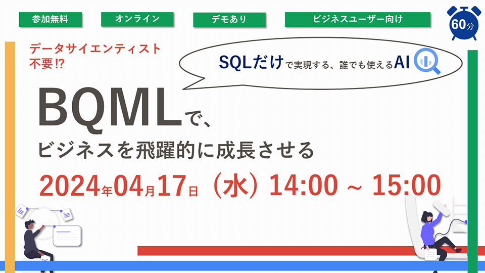 2024.04.04 イベント・セミナー 『ビジネスAI活用セミナー』開催のお知らせ ~データサイエンティスト不要!?SQLだけで実現する、誰でも使えるGoogle CloudのAI「BQML」で、ビジネスを飛躍的に成長させる~ 開催終了