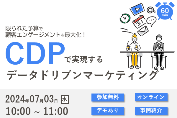 2024.05.22 イベント・セミナー 『CDP(カスタマーデータプラットフォーム)活用ウェビナー』開催のお知らせ~限られた予算で顧客エンゲージメントを最大化!CDPで実現するデータドリブンマーケティング~ 開催終了