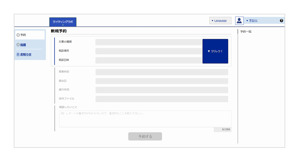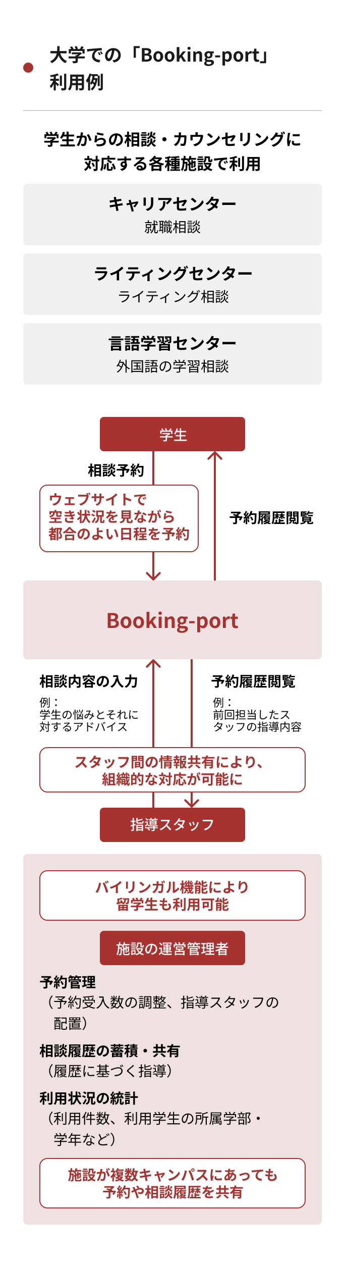予約可能日程の設定から、相談に対応するスタッフの配置、学生の予約受付までを一貫して管理。運営管理者・指導スタッフは、紙やExcelで予約管理を行う必要がなくなります。