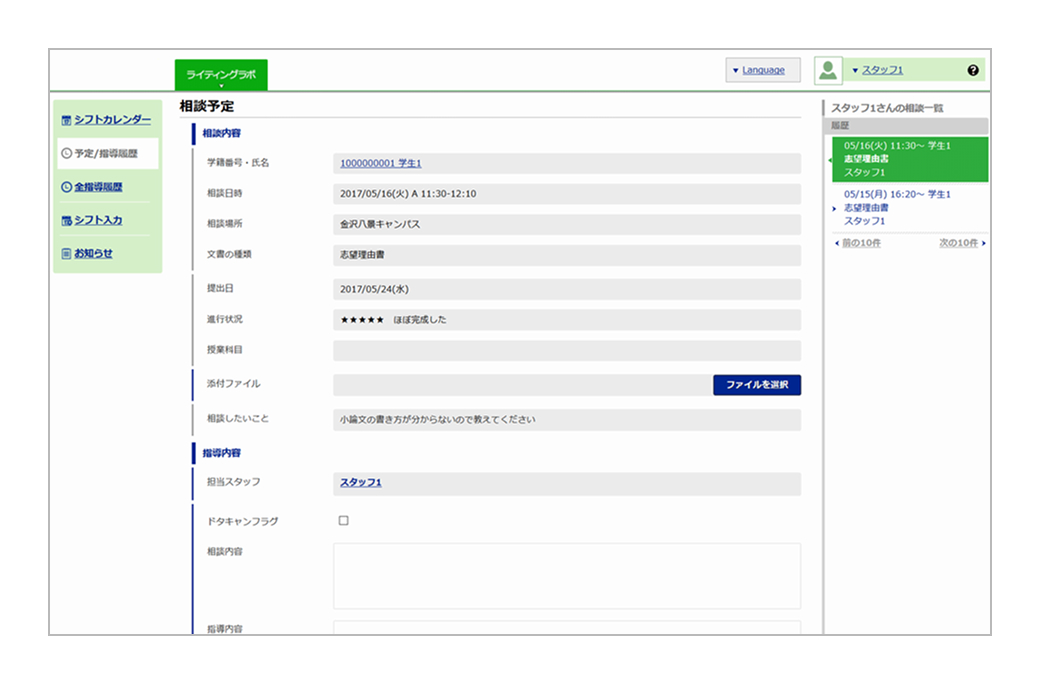 スタッフ間で指導・相談内容を共有できる仕組みとなっており、離れたキャンパス間であっても組織的な対応が可能になります。また運営管理者はスタッフの指導内容が把握でき、スタッフに対する指導や評価の材料として利用できます。