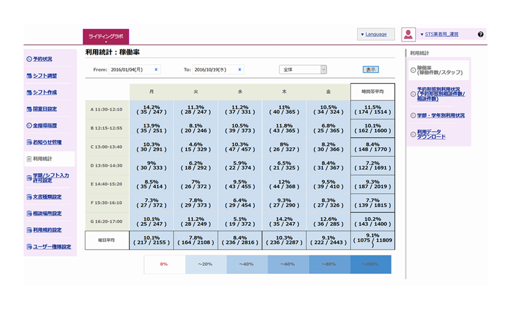 運営管理者は、利用件数や利用者の学部学年別内訳、スタッフの稼働率などの統計を取ることが可能で、施設の効率的な運営につなげることができます。