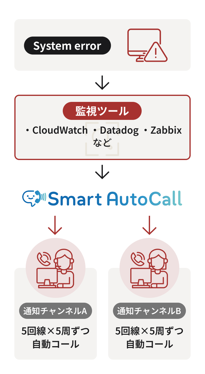 - Smart AutoCall は、監視ツールから通知を受けると、各チャネル5周ずつ、最大50回自動コールし、通話状態が確認できた時点でコールを停止