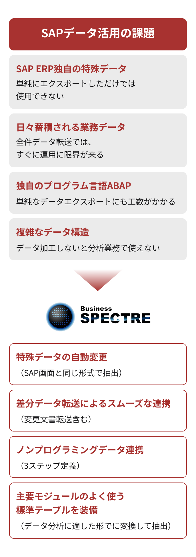 BusinessSPECTREは、独自の機能により、SAPデータ活用にまつわるさまざまな課題を解決します。
