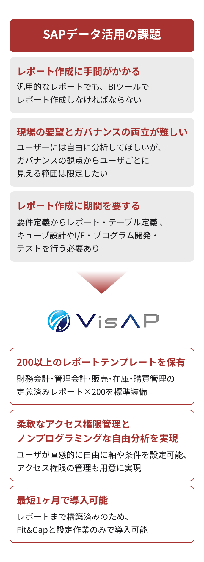 VisAPは、独自の機能により、SAPデータ活用にまつわるさまざまな課題を解決します。