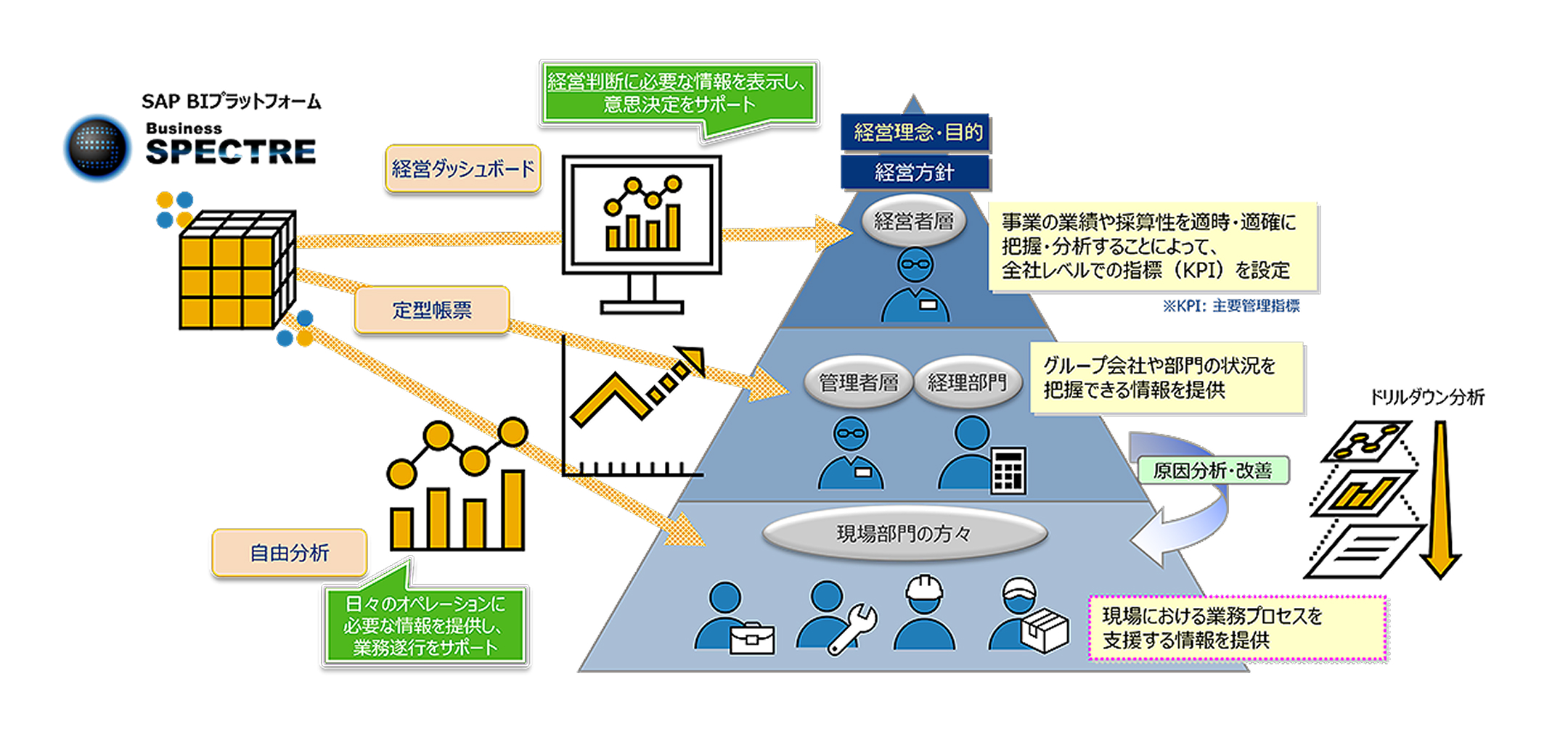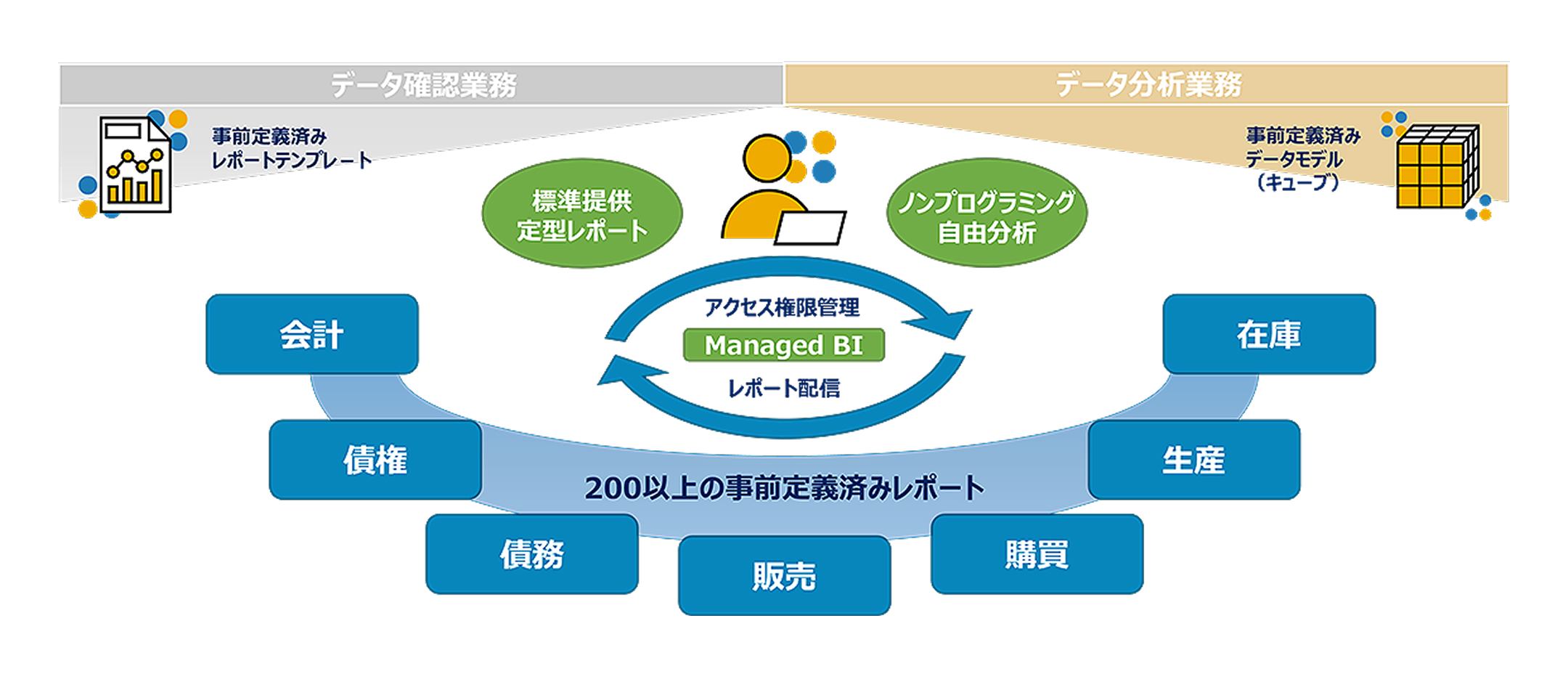 経営分析や予算管理など、SAP ERPのデータをさまざまな用途で活用することはもちろん、他システムのデータと組み合わせた多様なデータ分析も可能となります。