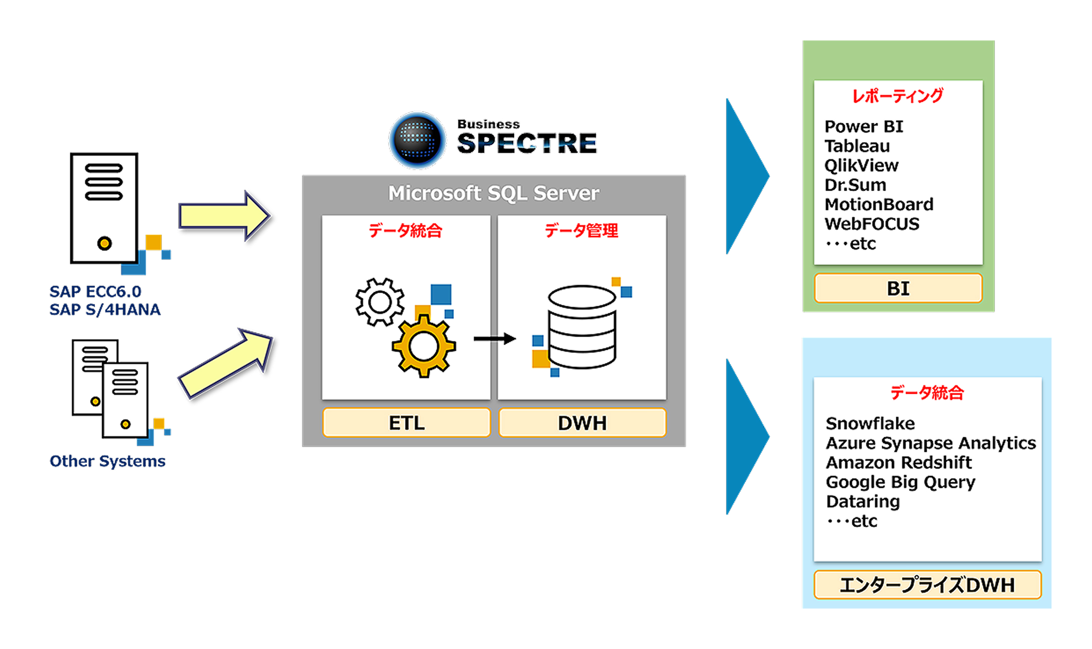 BusinessSPECTREのみを導入し、SAP ERPのデータをDWHに連携させ、そこから先の分析(データマートやBI)は他ソリューションとの組み合わせも可能です。