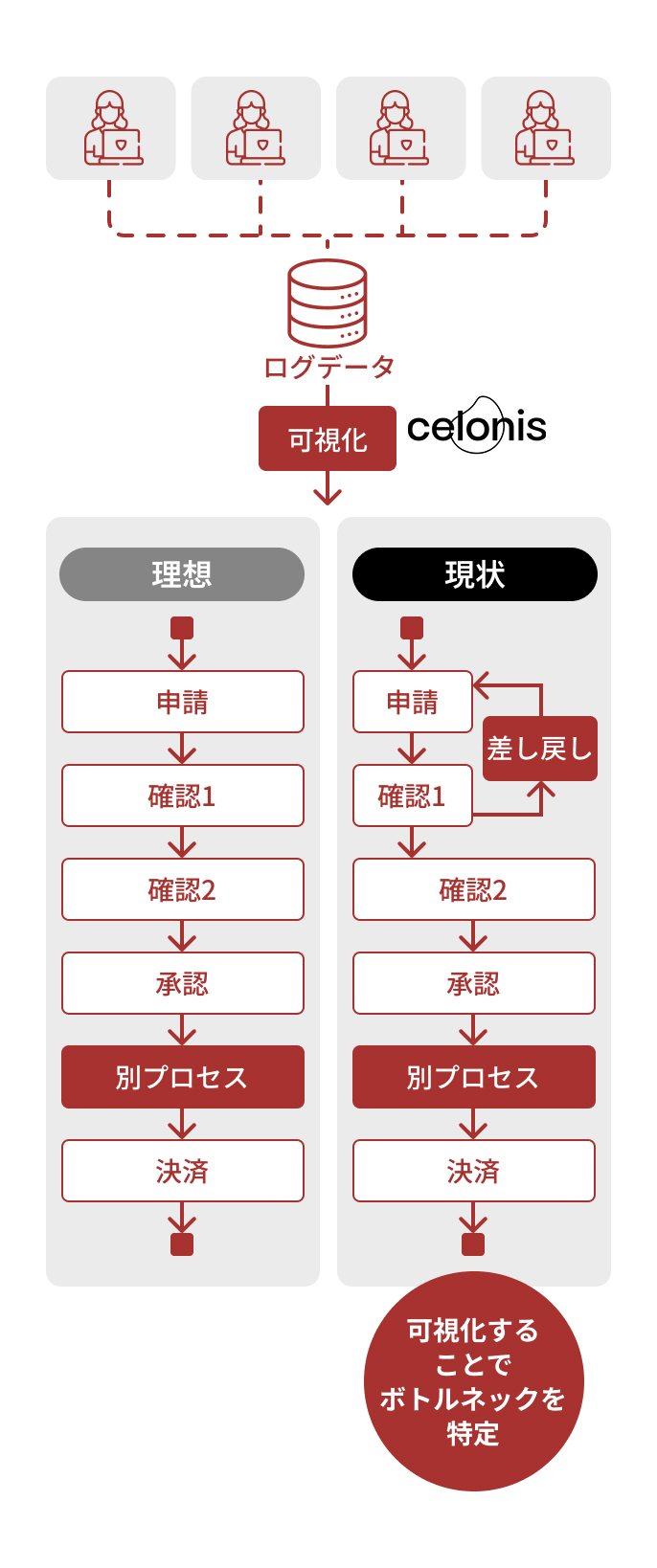 これに対し、プロセスマイニングでは業務システムなどに蓄積されたすべてのログを迅速に可視化し、一連の業務フローを再現することで、「ログ」という確かな事実・根拠に基づいた精度の高い分析を行うことができます。