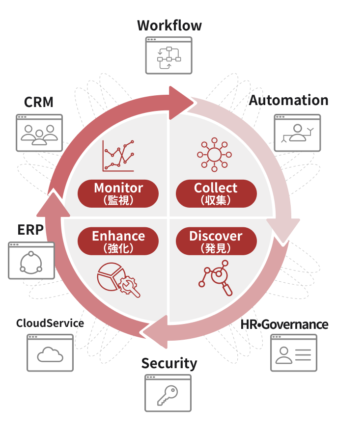 また、豊富なデータコネクタやアプリケーションを完備しているため、お客様の利用するさまざまなシステムと接続し、業務改善、自動化を推し進めることができます。