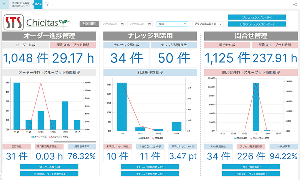 本アプリは、昨今急増しているServiceNowを使用したITSM(ITサービスマネジメント)業務における「オーダー管理」「問い合わせ管理」の効率的な分析に適したプラットフォームとなるように設計されています。システムサポートがCelonisパートナーとして活動する中で得たさまざまなノウハウを多数組み込んでおり、全体を俯瞰できるダッシュボードと、各分析項目を詳細に確認できる個別画面、プロセスやデータの可視化ツールなどを提供します。 これにより、ITSM業務のボトルネックや改善点を見つけ出し、迅速かつ適切な対応を可能にします。