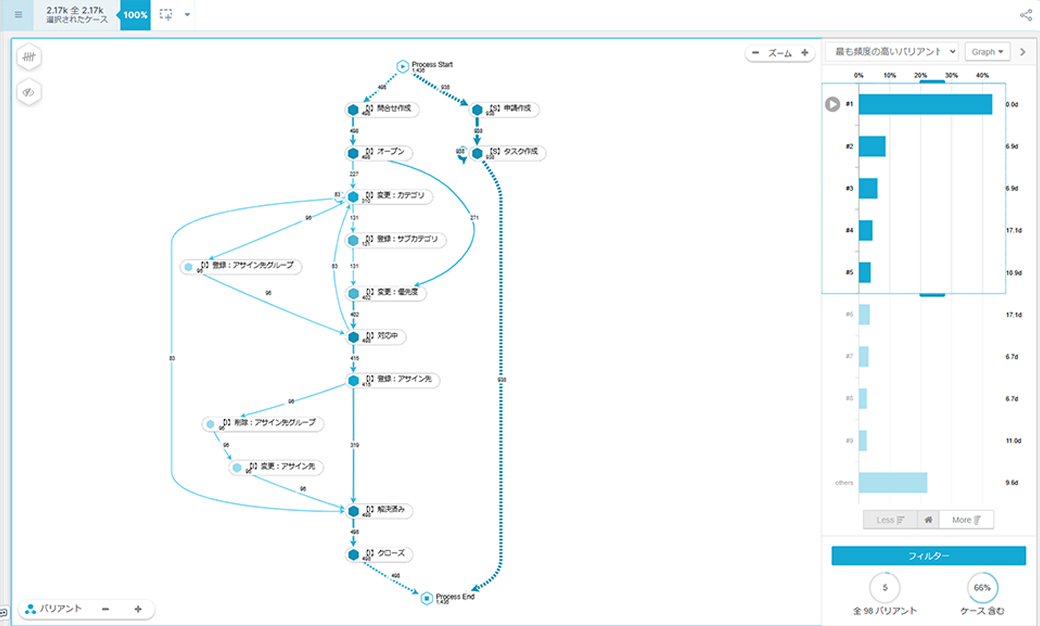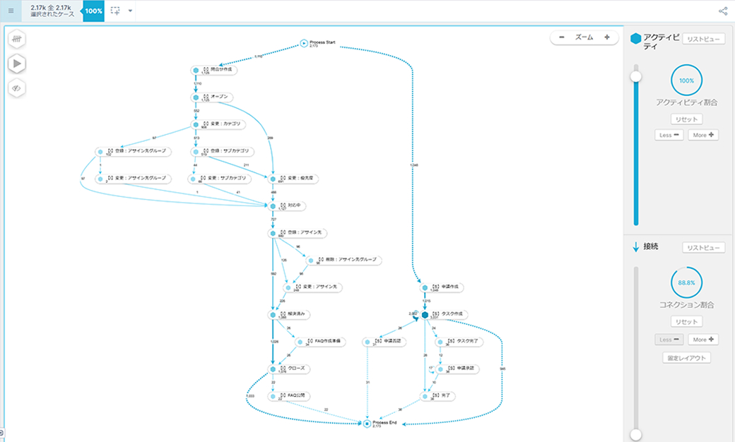可視化することで、各業務フローにおけるリワーク、ボトルネックとなっている課題、不健全なスループット等の特定が可能です。