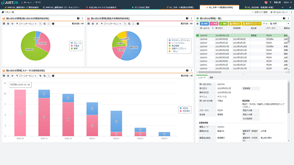 案件管理、活動管理、マスタ系管理(3〜5マスタ)、集計パネル(2〜3集計)