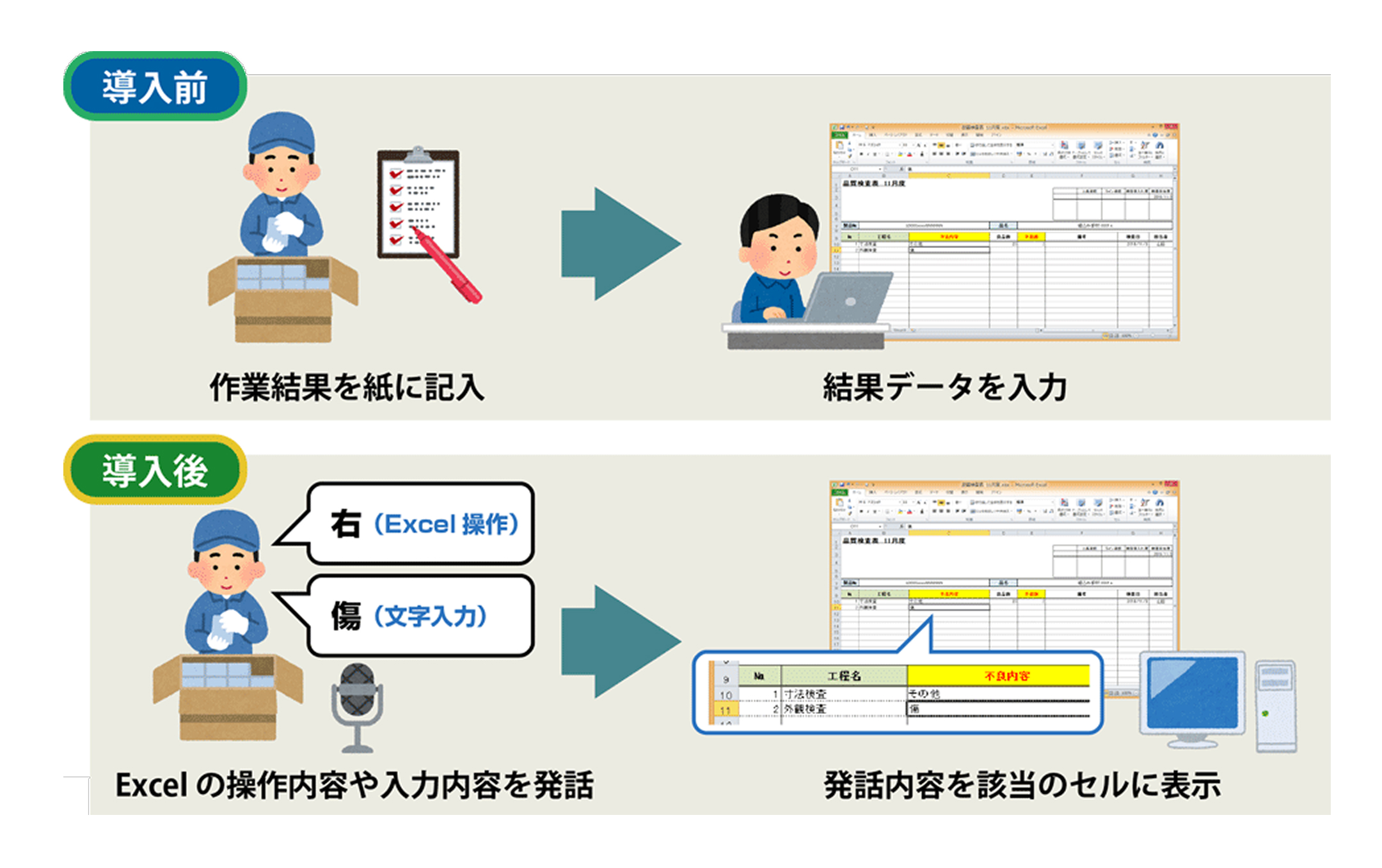 Excelの音声入力対応を実現し、Fax・電話受注/検査業務/入荷・出荷業務など幅広い作業の効率化をサポート
