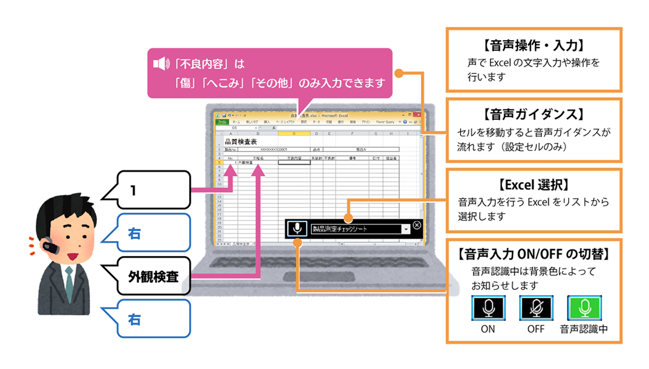 Excelの音声入力対応を実現し、Fax・電話受注/検査業務/入荷・出荷業務など幅広い作業の効率化をサポートします。